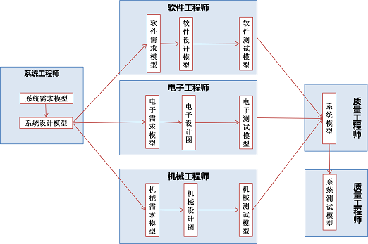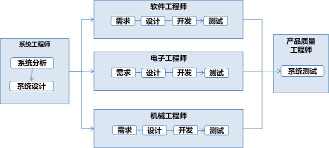 - 需要多种角色分工合作:系统工程师,软件工程师、电子工程师、专业工程师、测试工程师