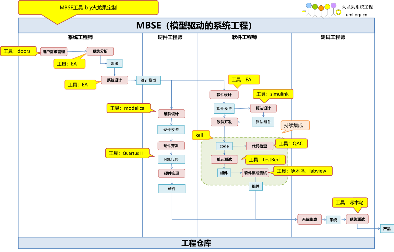 | 为了支持MBSE的方法论落地,火龙果选择MBSE中的各个环节的主流工具,集成为MBSE工具方案,打通各个工具之间的接口,实现MBSE贯穿数据流,并提供工程仓库集中存储各种工程数据。