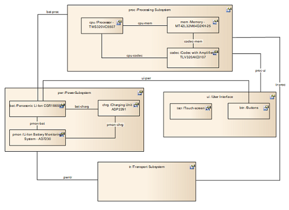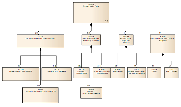 | Sys ML还可以对一个系统的内部各个结构的构成进行建模,如下是系统的内部模块定义图 |