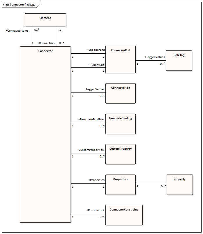 This diagram shows the Connector Class, its collections and its relationships to the Element Class. Association Target roles correspond to member variable names in the source interface. The associated Classes represent the object type used in each collection.
