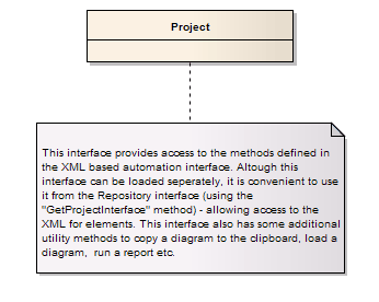 The Enterprise Architect.Project interface. This is the interface to Enterprise Architect elements; it also includes some utility functions. You can get a pointer to this interface using the Repository.GetProjectInterface method.