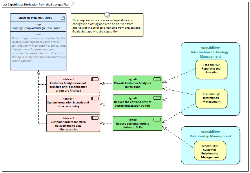 Enterprise Architect允许使用构造型的UML扩展机制对Capabilities进行建模。与任何基于文本的元素一样,在使用功能时可以使用规范管理器,并提供引人注目的电子表格或文字处理器,如吸引许多商务人士的视图。功能通常在层次结构中创建,允许将高级功能分解为更细粒度的元素,通常分为三个级别。可以在图表中查看功能,其中可以使用嵌套元素可视化层次结构,嵌套元素可以着色以创建视觉吸引力并打印到A1或A0中的大幅面纸上以创建引人注目的海报。可以使用图表属性隐藏功能构造型,使图表更具吸引力。