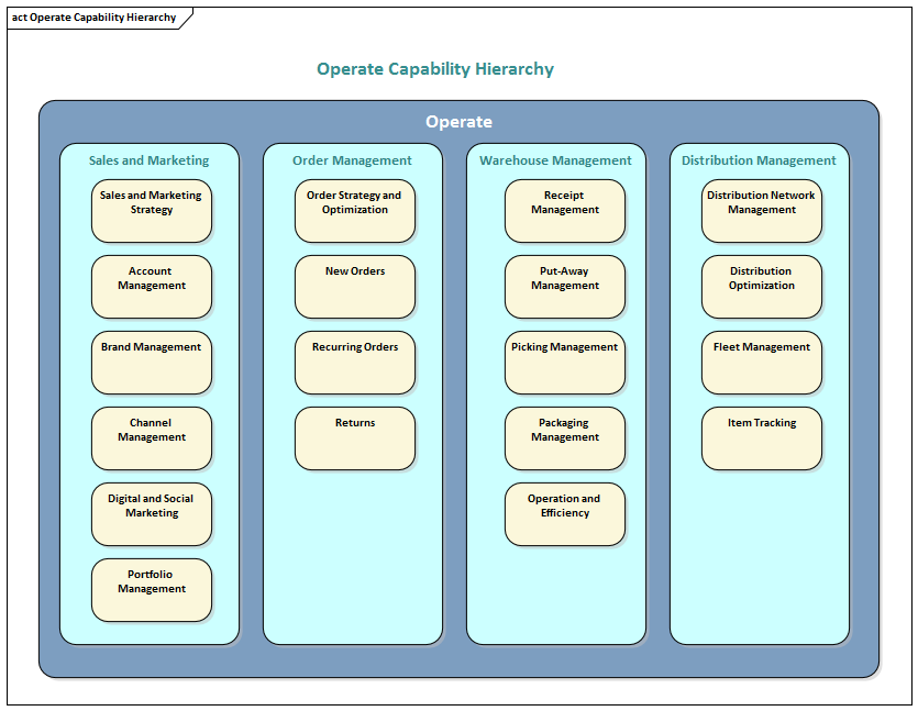 业务能力是其他架构领域(包括信息,应用程序和技术架构)开展工作的基石。它们提供了一种查看业务执行或需要执行操作的方法。与业务流程相比,它们更容易创建,创建时间更短,并且与业务运营提供直接的线性关系。使它们更容易的一件事是它们可以被视为业务流程之上的抽象,因为它们的建模与能力实现或将要实现的方式无关。