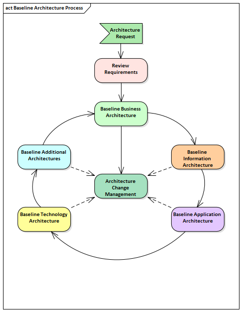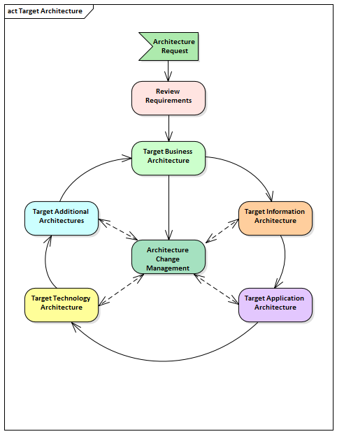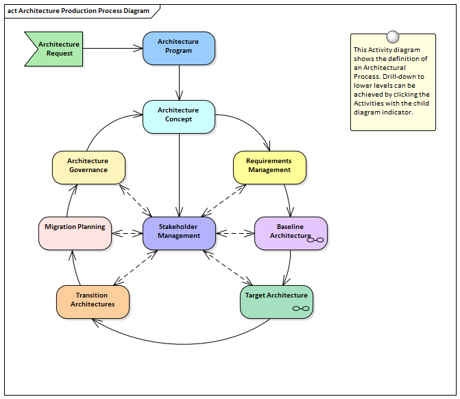 需要一种体系结构过程或方法来规定应该开发体系结构的方式。并非所有框架都提供已定义的流程,并将其留给组织来创建和配置自己的流程。Enterprise Architect可用于在任何详细级别定义流程,并使用向下钻取到子流图功能,可以详细说明流程的更细粒度方面。UML活动图表可用于创建一套表示架构创建过程的图表,包括流程,任务,输入和输出以及执行流程中各个步骤的人员。Enterprise Architect还有一个名为Software Process Engineering Metamodel(SPEM)的扩展,可用于在需要时严格定义流程。在大多数情况下,UML活动图足以创建详细的流程。