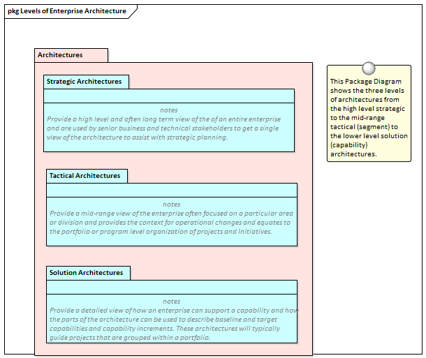 架构是架构内容的关键组织机制; 它们是提出的问题或机会的设计或解决方案声明,或现有系统的文档。架构可以在许多不同的级别定义,包括: