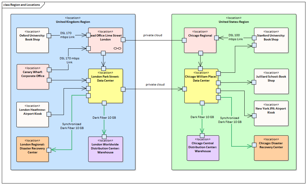 Enterprise Architect提供了各种各样的位置建模工具,在基础架构层面尤其如此。可以扩充用于对业务位置建模的相同元素,以创建表示基础设施如何与设施相关的表达模型,包括不同位置之间的通信结构的高级模型和所使用的协议。统一建模语言端口允许深入到设施的内部结构。例如,高级图可能使用每个设施边界上的端口描述公司办公室和数据中心之间的通信路径。然后,子图可以描述构成数据中心或公司办公室的路由器,交换机,服务器和其他基础架构元素。