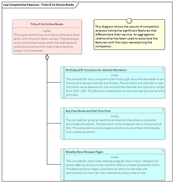 Enterprise Architect is a flexible platform that can be used to assist the analyst with both Benchmarking and Market Analysis, as it has convenient tools for recording research findings and has the ability to express these in diagrams and documentation generated from the model. Request for Information (RFI) documents could be generated directly from the model and the powerful Relationship Matrix can be used to demonstrate gaps between current and best practice.
