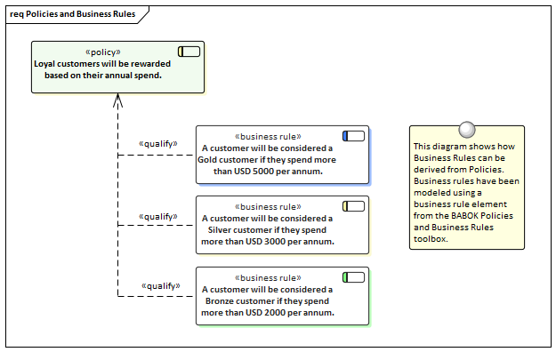 Policies and Business Rules are critical to the success of an organization; they inform the way that processes are performed and guide operational business decision making. Modeling the Policies and Business Rules in Enterprise Architect helps you to link business rules to the policies that define them, and in turn to business goals. Enterprise Architect allows all these elements to be created and managed, and analysis can be performed using a number of tools to determine implementation of the rules and how a particular business or technical solution implements the business rules and therefore the policies.