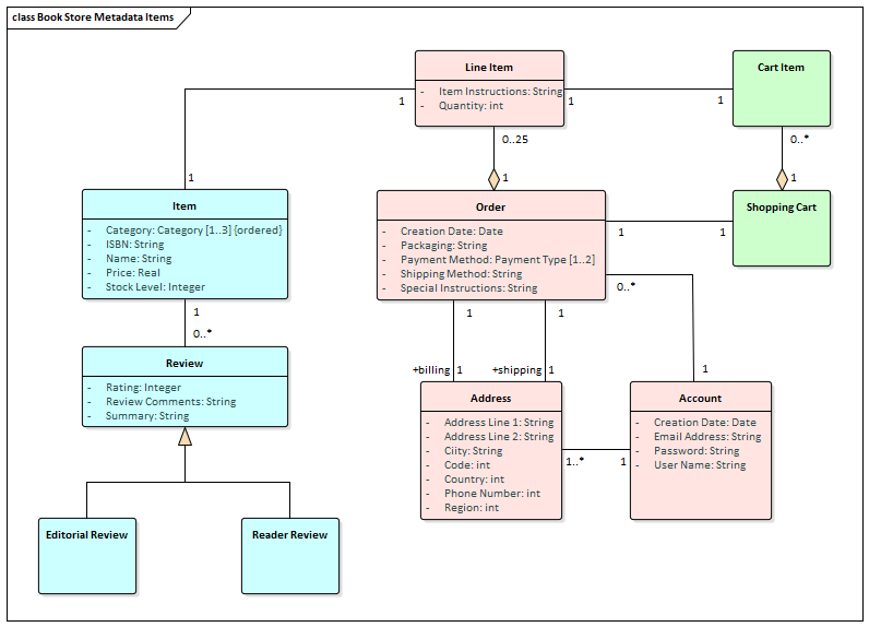 A Class diagram can be used to model important data elements in the domain. The elements are modeled using UML Classes, and Names, Aliases, Descriptions and details such as Attributes can be entered for each Class. The elements can be related to each other using relationships such as Association and Generalization. These elements can then be used throughout the model as a data dictionary, including in element notes where they can be referenced.