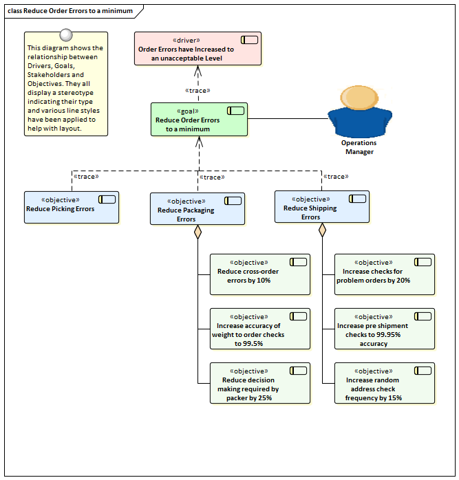 Enterprise Architect can be used to model the Goals and Objectives and relate them to each other, with each Goal being decomposed into a number of Objectives that can be measured. Stereotypes can be used to create Goal and Objective elements, and these can be added to any number of diagrams. The Project Browser provides a way of structuring the Goals, adding the Objectives as child elements placed under the applicable Goal. The Specification Manager is a useful tool for creating, viewing or presenting the Goals and Objectives in a workshop. It is a text based tool and allows the Goals and Objectives to be viewed in a word processor or spreadsheet interface.