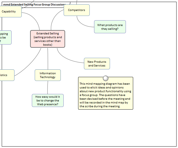 A Mind Mapping diagram can be used to record a wide range of information in a compelling format that mimics the way we think about ideas as a graph of thoughts. It can also be used in Workshops, Focus Groups and other meetings with Stakeholders or team members as a note taking tool. Other elements in the model can be connected to the Topics and Sub Topics in the Mind Mapping diagram to create powerful and expressive relationships between the ideas and their specification or implementation.