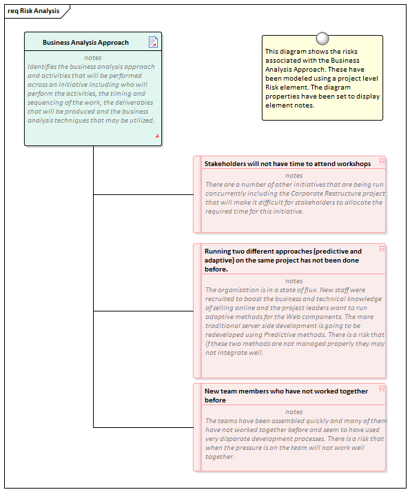 Enterprise Architect supports the modeling of risks at the project or the element level. A project manager or senior analyst will typically define risks at the project level, whereas a business analyst, while they might assist with project risks, would typically record risks at the level of requirements and modular units of the system such as components.