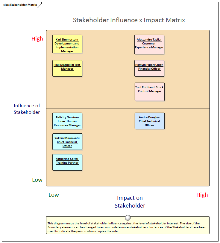 A Relationship Matrix can be used to present a number of views of the stakeholders. The matrix is a spreadsheet like view that is often more appealing to many managers and non-technical audiences. Any number of matrices can be created that relate stakeholders to other models elements including other stakeholders.