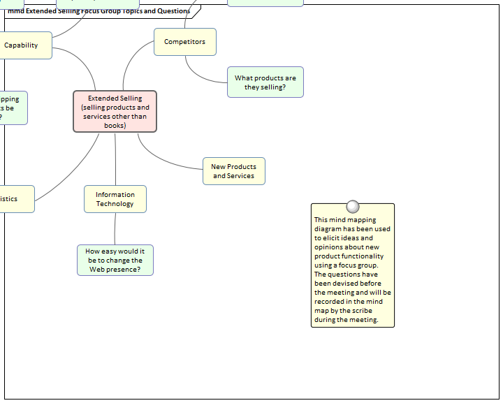 A Mind Mapping diagram can be used to record the stakeholder's statements during a Focus Group meeting. A Central Topic can be created that represents the theme of the meeting and if it has been planned and structured, Main Topics can be added prior to the commencement of the meeting. It is useful to have a scribe creating the MindMapping Diagram as it allows the facilitator to interact with the stakeholders. If the screen is projected it allows the stakeholders to visualize the information, opinions and ideas as they are recorded.