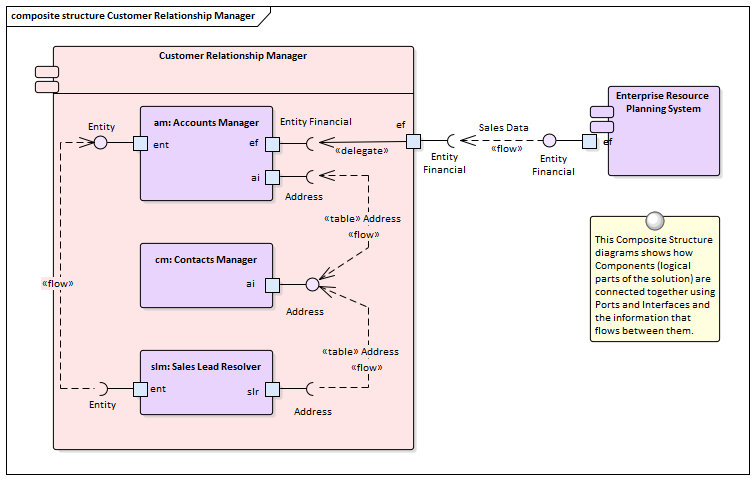 The composition of a system can be shown using a Component diagram where systems are displayed in a hierarchy including drill down to other Component diagrams. This allows a complex system that is made up of a number of subsystems to be modeled.