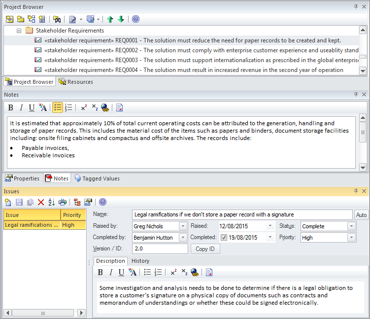 Enterprise Architect is a powerful modeling platform that has an impressive range of ancillary tools over and above its core modeling functionality to assist the modeler working in a dynamic business environment. The implementation of a solution will take time and stakeholders will have concerns and issues that will not have been present at the time they articulated their needs and requirements. These can be recorded in the model either at the level of the model or at the level of an individual element, such as a requirement or any other element.