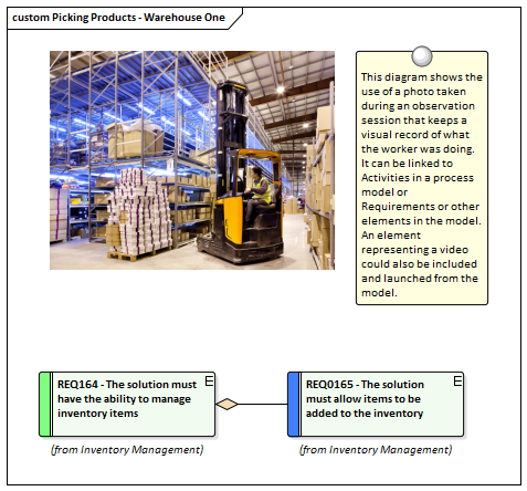 Observations are used to illicit information and provide understanding and clarification by viewing a person performing a process in its context. Typically the observations are recorded with paper notes and photography but Enterprise Architect can assist with preparing for the observation by detailing the objectives and the planning approach. The results of the observation including scanned notes and photographic images can be stored in Enterprise Architect, ensuring that they are available to all modelers. The results of the observation, including process diagrams and statements of how a process could be improved, can be modeled in Enterprise Architect and linked to a variety of elements. Tools and material used by the process performer such as scanners and procedure manuals can also be modeled in Enterprise Architect.