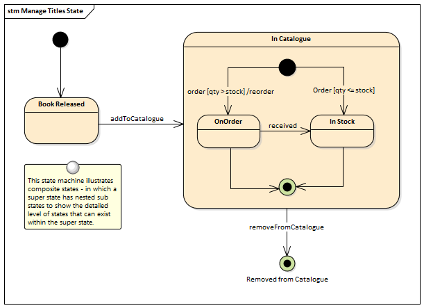 A StateMachine diagram is a powerful way of presenting information about the lifetime of a business or technical entity. It can be used to describe the important conditions (States) that occur in an entity's lifetime or cycles. Typically only entities that have important stages in their lifetime are modeled with StateMachine diagrams. The entity is said to transition from one State to another as specified by the StateMachine. Triggers and Events can be described that allow the state transition to occur and Guards can be defined that restrict the change of state. Each State can define the behaviors that occur on entry, during and exit from the State.