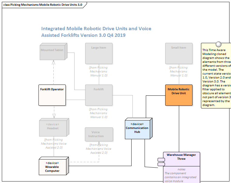 There is a wide range of tools that can be used in conjunction with Time Aware Modeling, such as the ability to filter a diagram to only highlight elements that are part of the version represented by the diagram. The effect of this will be to obscure all elements other than those that have been added or cloned into the specified version. The Traceability window can be used to keep track of the complex relationships that exist between different versions of the elements. Diagram Legends can be used to color the diagram's elements based on the version they belong to, effectively creating a colored chronology of change or transition from version to version. Diagram Filters can be used to obscure elements based on more complex criteria, such as to display only the elements that are part of either version 2 or 3 and that have a status of 'Approved'.
