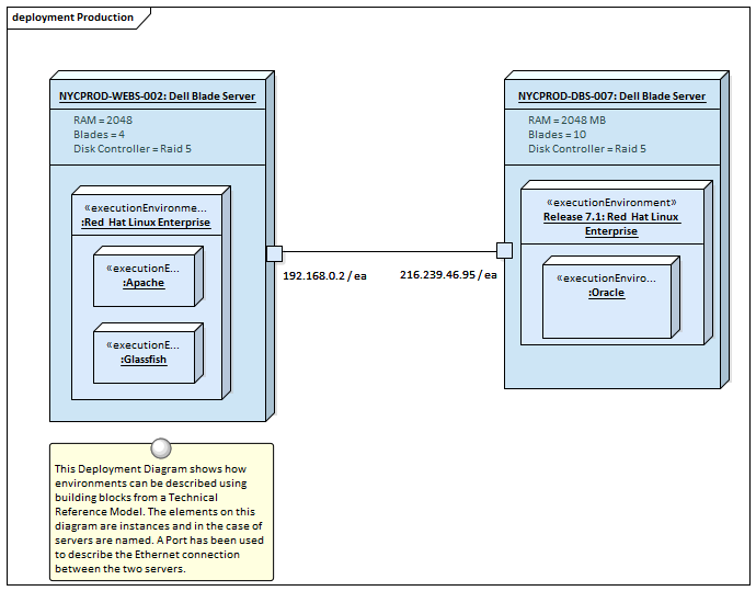 The Deployment diagram can be used to model a wide range of infrastructure and networking environments including physical and virtual environments. It is quite common to model a number of different environments including: production, pre-production, test and development environments. The diagram can be used to model Servers, Devices, Networks, Execution Environments. Switches, Routers, IP Addresses and the software components and Artifacts deployed. |