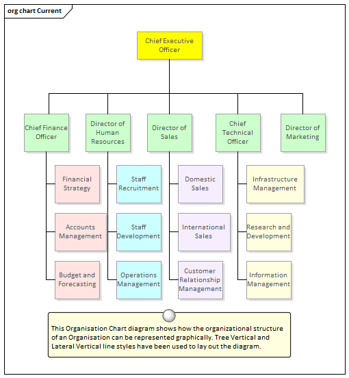 The Organizational Chart can be used to create any type of chart, including a Functionally Orientated, Market Orientated or Matrix Model chart. A number of charts could be created, representing different current and future states of the enterprise. |