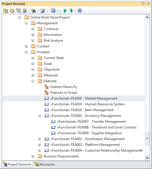 The Project Browser can be used to create and manage the structure of the repository by adding and deleting, moving and copying Packages, elements, Features and diagrams. It is often the primary tool for exploring and browsing through the elements in the repository and finding things of interest. A modeler working with an open diagram will often want to locate a diagram object in the Project Browser as a way of finding out what Package it belongs to and what its peers are. |