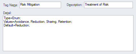 Tagged Values are one of the Unified Modeling Language's built-in extension mechanisms. They provide a useful and productive way of adding extra properties to elements, attributes, operations or connectors; just as you would add an additional column in your favorite spreadsheet. They have a Tag name and a Value, and additional Notes. You can use a wide range of user interface controls to assist users when entering a value for the tag, such as drop downs, spin controls, date and color pickers, and more.
