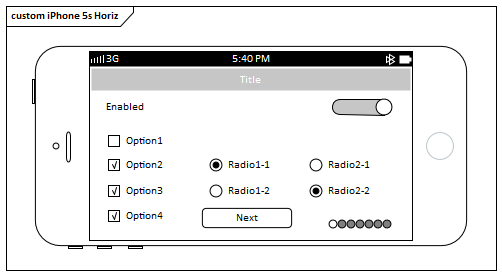 These icons each generate a frame for the device type you have selected. A prompt displays for you to specify portrait or landscape orientation. (The main illustration shows a landscape iPhone 5s frame and a portrait iPhone 4s frame.) Tagged Values: