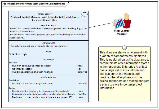 A requirement should only be able to be interpreted in one way. Requirements that are ambiguous can lead to a project being delayed, over budget or having the wrong functionality or behavior. Enterprise Architect can assist with ambiguity by helping analysts to record comments about the requirements, using the Element Discussion facility. |