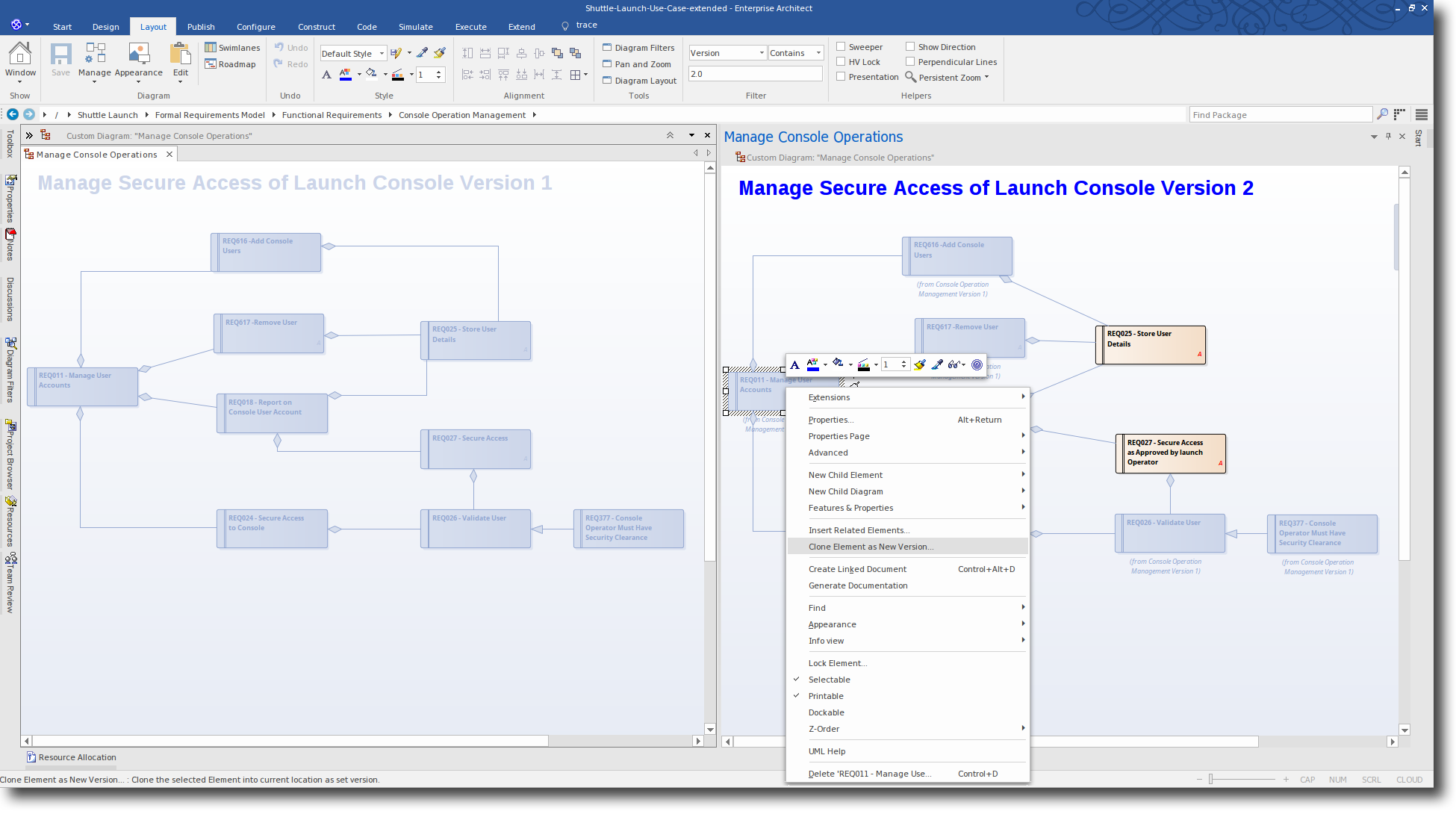 Creating a clone of the linked elements on a diagram is a simple migration process driven by version number. The element migration process builds a clone of your selected element and updates it with a user defined version number. In addition to duplicating their base version, the necessary relationships between the clone and the original are created to ensure the logical consistency and traceability of the new model. When cloning an element as a new version, Enterprise Architect intelligently determines where to route the new element's relationships to correctly reflect the intent of the new model version.