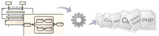 Software code can be generated from StateMachine, Sequence and Activity diagrams, and hardware description languages from StateMachine diagrams.