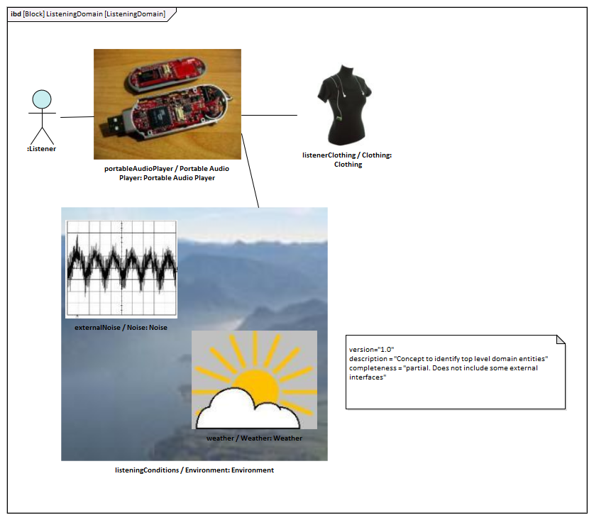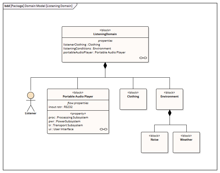 In the example, the ListeningDomain is defined as a system containing other subsystems; the domain contains subsystems that define the Listener (that is, User), the Portable Audio Player, Clothing (which the user wears), and the External Environment.
