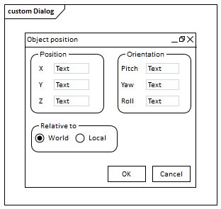 Generates an element that represents a dialog outline, with a title (the element name). This has several components that you can expose and define in the element 'Properties' dialog, some using the Tagged Values on the 'Wireframing' tab of the 'General' page, and some using the 'Wireframe' page of the dialog. Tagged Values: