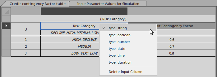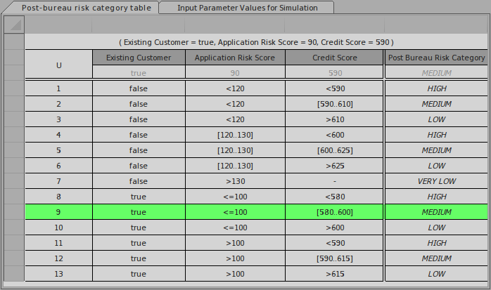 This button is Enabled when the decision table is defined for a BusinessKnowledgeModel. Activate tab "Input Parameter Values for Simulation", fill the values and click this button. The test result will be presented on the decision table, with the runtime values of inputs and outputs displayed and valid rule(s) highlighted. The user can use this functionality to unit test a BusinessKnowledgeModel without knowing the context and later on invoked by a Decision or other BusinessKnowledgeModel. Menu options are available for the this toolbar button. For more information, click the See also link. |