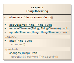 Aspects are modeled using Classes with the stereotype aspect; these aspects can then contain attributes and methods as for a normal Class. If an intertype attribute or operation is required, you can add a tag 'className' with the value being the name of the Class it belongs to. Pointcuts are defined as operations with the stereotype <<pointcut>>, and can occur in any Java Class, Interface or aspect; the details of the pointcut are included in the 'behavior' field of the method. Advice is defined as an operation with the stereotype <<advice>>; the pointcut this advice operates on is in the 'behavior' field and acts as part of the method's unique signature. afterAdvice can also have one of the Tagged Values returning or throwing. |