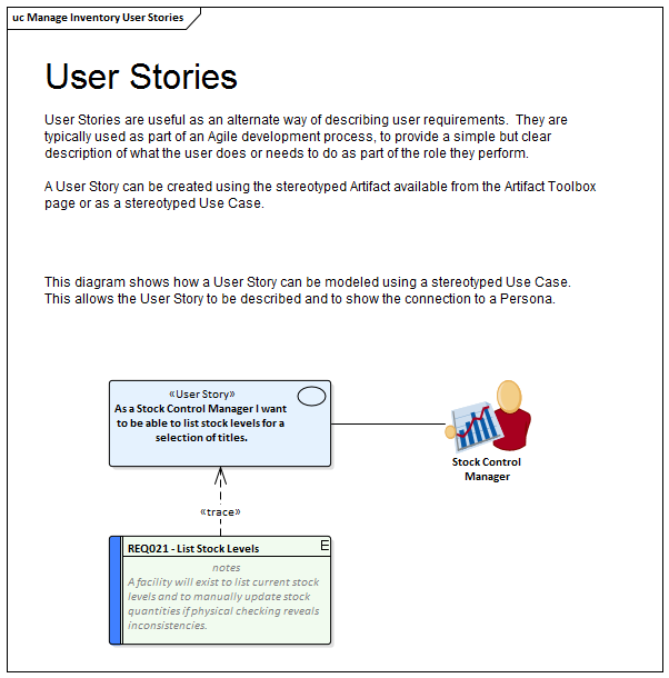 Enterprise Architect is an open platform that supports any requirements engineering process. The tool has a rich feature set and is highly configurable and its flexible design means that what ever method is being used the modeler will find features to help. So whether the team is using formal Requirements, Use Cases, User Stories, Story-Boards in any combination Enterprise Architect can be used to develop, manage and document the requirements. The implementation of the UML extension mechanisms means that any type of requirement can be created and managed using built-in types or by using Stereotyped elements and Tagged Values.