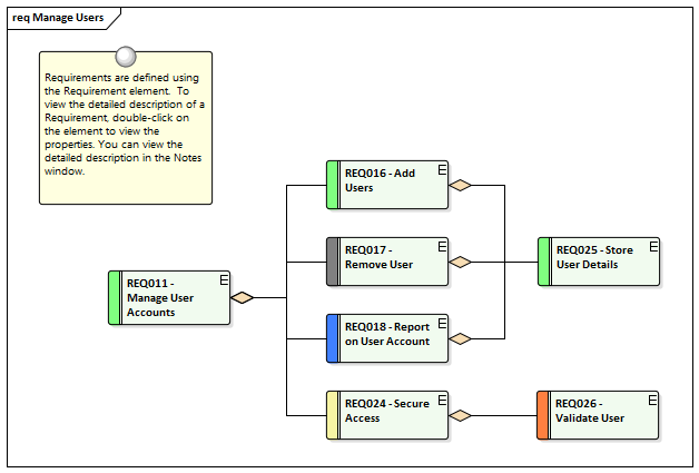 A Requirements diagram is one of Enterprise Architect's extended diagram types. It allows an analyst to model requirements visually, showing how requirements relate to each other and how they connect with other elements in the model such as Business Drivers, Constraints, Business Rules, Use Cases and design Components. The Requirement will be the main element seen on these diagrams; it has a name, a description and a series of properties (called attributes in some literature) such as status, complexity, difficulty and author. Enterprise Architect is designed to be a flexible tool and allows requirements to be created directly in the repository without the use of a diagram, but the diagram has proven to be a powerful tool to express the important role requirements play in the development process.