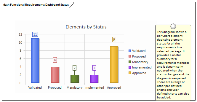 Requirements can be managed in a variety of ways from the use of the Project Gantt Chart to the Dashboard diagrams that show properties such as status for a set of requirements.