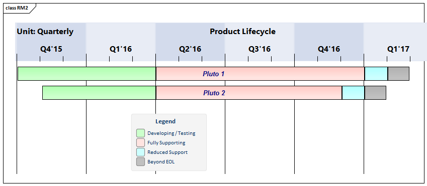 This diagram shows an example Roadmap that documents the planned lifecycle for two products through development, release, support and retirement, by quarter over a period of one and a half years.