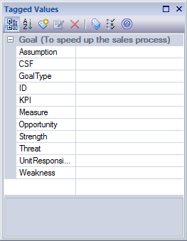 The MDG Technology for TOGAF makes extensive use of Tagged Values for assigning custom properties to the various elements specific to TOGAF. It is recommended that you keep the Tagged Values window docked and visible at all times when creating or viewing a TOGAF model.
