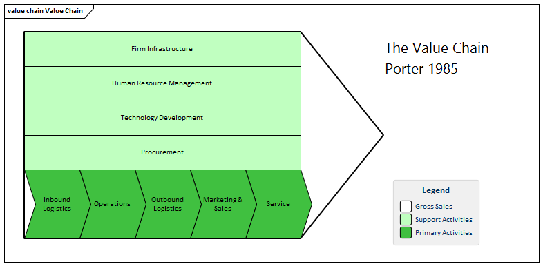 Enterprise Architect is able to link each activity in the Value Chain to support documentation, including budgets and benchmark results. The ability to link to competitors' websites and web based market information extends the power of the Value Chain beyond a traditional text based model.
