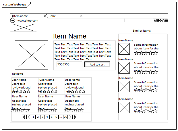 The 'Webpage Wireframe' Diagram Toolbox pages provide the templates for modeling the schematics, blueprints or framework of a website, defining how the web pages work. You can see and build on an example of how to model the webpage interface by dragging the Webpage Pattern icon onto a diagram.
