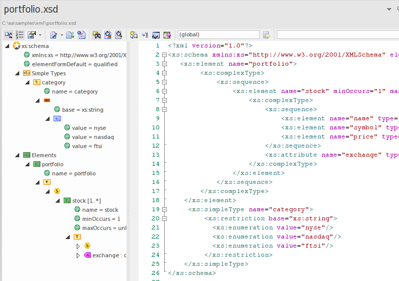 This image shows the schema used in the validation. The declaration of a 'portfolio' element can be seen here to be made up of one or more 'stock' elements. Each stock element in turn, requires an 'exchange' attribute naming a code for the stock exchange in question.