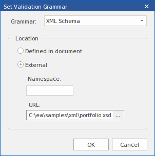 Select the schema location. 'Defined in document' is selected by default. It is usual for an xml document to specify the schemas that governs its content. To choose a different schema from that defined in the document, select 'External' and provide either a URL or file path. Examples: