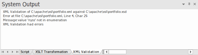Click OK. The output of the validation will be displayed in the 'XML Validation' tab of the System Output window. |