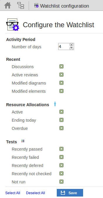 WebEA中的监视列表工具可帮助您快速识别模型中的最近活动。每个用户都可以定制他们的监视列表,以监视具有各种特征的各种对象和特征中的任何活动。每当生成监视列表摘要时,都会检查所有感兴趣的对象类型的最近活动以及显示的匹配对象的计数。可以单击所有匹配的对象计数以显示与特定活动类型匹配的对象列表。