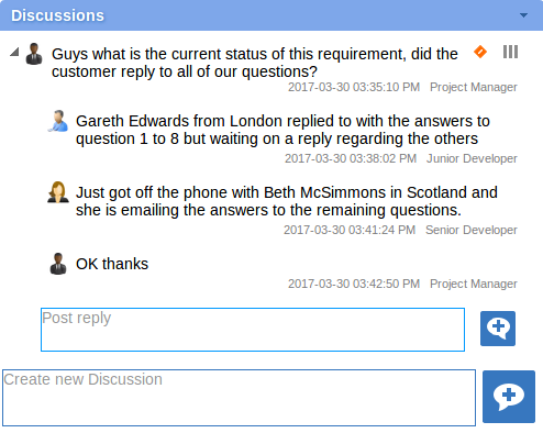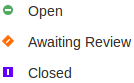 讨论文本右侧是两个图标。第一个是“状态”图标,第二个是“优先级”图标。图标的外观取决于状态和优先级的当前设置。要设置状态或优先级,只需单击相应的图标,然后从列出的选项中进行选择。这些是: