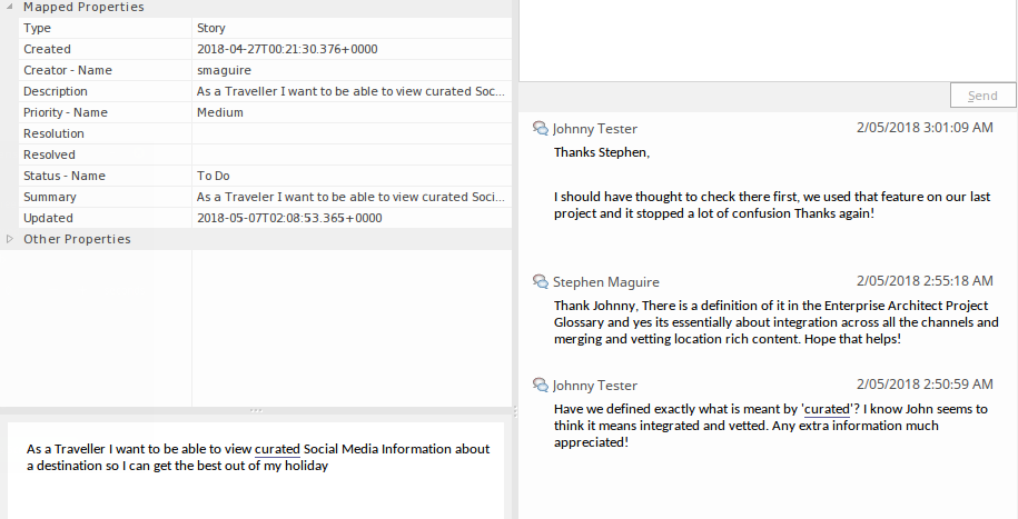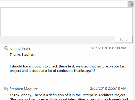 通过在顶部框中键入并按“发送”可以发布新的讨论。使用的用户名将是Integration Provider上授权的用户名。如果已将通用凭据添加到服务器配置中,则本地模型的用户名也将添加到注释的开头。