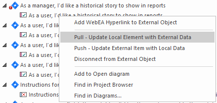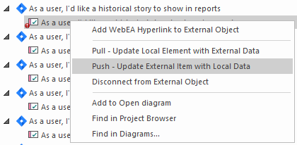 如果在创建或链接项目后修改了本地元素或外部项目,则会在项目图标的顶部显示指示符。右键单击Enterprise Architect元素,然后选择“推送 - 使用本地数据更新外部项”。