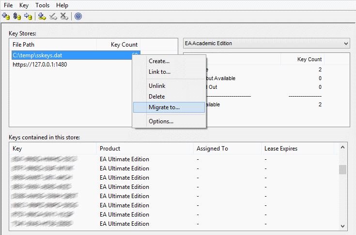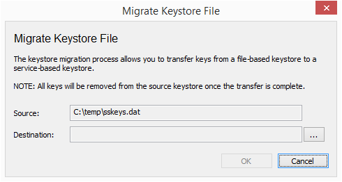 要从其他密钥库迁移共享密钥,首先需要使用File |定义与每个源密钥库的连接 链接到菜单项。然后确保在列表中选择了源密钥库,选择菜单项File | 迁移到......